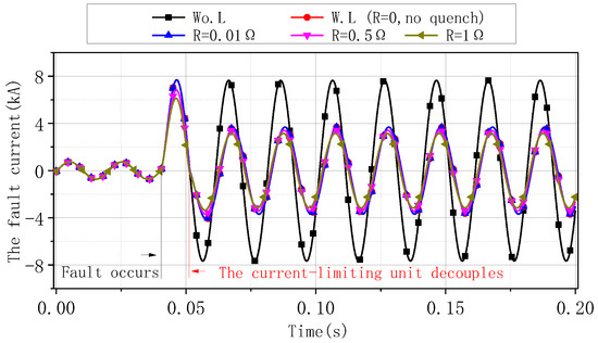 - Considering that the quench-type parallel inductance can limit the first peak value of the fault current, a quench-type improvement scheme was proposed. The scheme can limit the first peak value of fault current to a certain extent by the quench resistance at the initial stage of the fault. After the parallel inductance is decoupled, the quench resistance and the current-limiting inductance jointly limit the fault current, which improves the current limiting capability of the limiter and reduces the interruption requirements of the circuit breakers.