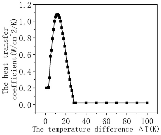 A 50 mm long tape was used, and the tape was immersed and cooled by 77 K liquid nitrogen. Four models for the tape were built: Model 1 (considering superconductivity and heat transfer), Model 2 (considering superconductivity and heat insulation), Model 3 (excluding superconductivity and heat transfer), and Model 4 (excluding superconductivity and heat insulation). The current-sharing and the temperature rise characteristics of the tape under the current amplitudes of 60 A, 80 A, 100 A, 200 A, 300 A, 400 A, 500 A, 600 A, and 700 A sinusoidal excitation were simulated. The heat transfer coefficient of the heat transfer boundary [20] is shown in Figure 5.