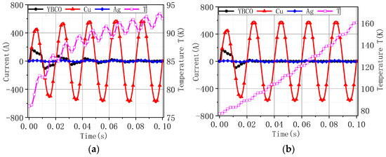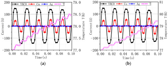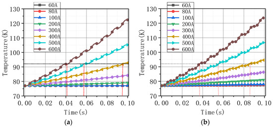 Figure 6 and Figure 7 are, respectively, the current diversion and the highest temperature value under 200 A and 600 A in Model 1 and Model 2. Model 1 considered the heat transfer power between the tape and liquid nitrogen, and Model 2 simulated adiabatic conditions. When the heat exchange was taken into account, the temperature rise was slightly lower. As the temperature increased, the current-carrying capacity of the superconducting layer YBCO decreased, the current was mainly transferred to the reinforced copper layer, and the current value gradually increased. When the temperature of the superconducting layer was higher than 92 K, the current in the YBCO layer was almost 0. The higher the tape flow was, the faster the quenching speed was.