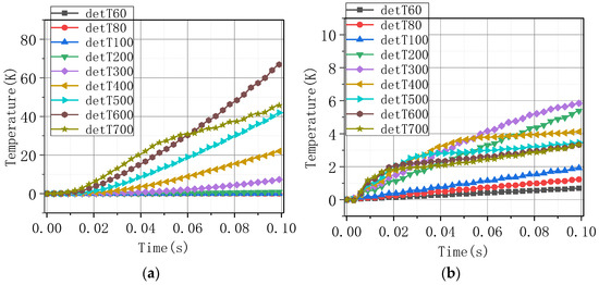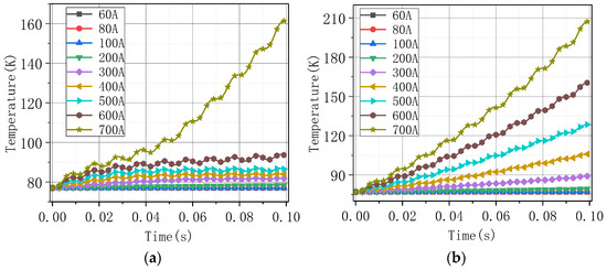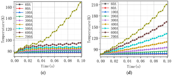 Figure 8 shows the temperature rise of Models 1–4 under current amplitudes of 60 A, 80 A, 100 A, 200 A, 300 A, 400 A, 500 A, 600 A, and 700 A sinusoidal excitation. As the current increased, the tape’s temperature rose faster. Compared to the heat transfer boundary, the tape’s temperature rose faster with the adiabatic boundary. Compared to superconductivity, the tape’s temperature rose slightly faster without considering superconductivity.