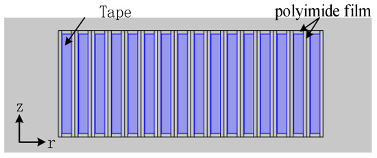 A small coil with 16 turns was taken as the analysis object. The coil is made of tape wrapped with a layer of 70 µm thick polyimide film. The inner radius of the coil is 82.5 mm and its model is shown in Figure 10. The coil’s inductance is 104 μH, and the critical current is 62 A.