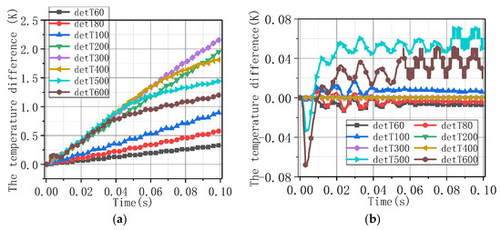 Figure 9 shows the temperature rise difference on the tape under different current-carrying conditions between Model 1 and Model 2, and between Model 1 and Model 3. The legend “detT + value” indicates the temperature difference between the two calculation models under the current excitation of the value. The temperature rise difference under adiabatic and heat transfer boundary was larger. Under the conditions, considering superconductivity or not, the temperature rise difference was smaller, all of which were lower than 6 K. The temperature rise difference increased with the current value below 300 A and had a downward trend when the current was higher than 400 A. This is because, under low current, the superconducting layer has current-carrying capacity, along with lower heat. When the current is large, the speed of the superconducting layer losing current-carrying capacity becomes fast as the current increases, and the tape’s working state is closer to the state of ignoring superconductivity.