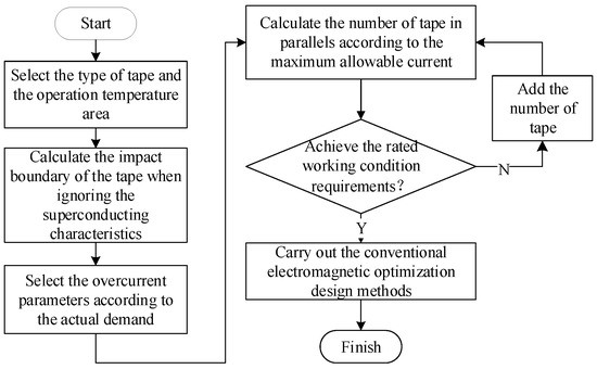 Aiming at the design of the quench-type parallel inductance, this paper proposed a design method based on the simplified calculation of the number of parallel tapes. The key point was to calculate the number of parallel tapes according to the simplified calculation method, i.e., to ignore the superconducting characteristics and calculate the impact boundary curve of the tape according to the normal conducting wire. First, the allowable over-current multiples were selected according to the over-current requirements. Then, the number of parallel tapes required for the parallel inductance was determined according to the maximum through-current and allowable over-current multiples. Last, the electromagnetic optimization design was carried out according to conventional methods. The previous design idea was to obtain the number of parallel tapes in the electromagnetic optimization process, and the magnetic field anisotropy of the tape needs to be considered. This method obtain the number of parallel tapes first and then optimized the design. The influence of the magnetic field can be ignored and the design difficulty can be reduced. The overall design process is shown in Figure 14.