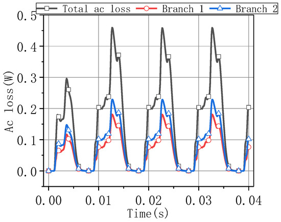 Based on the H-formulation method, the AC loss calculation model of the quenched superconducting parallel inductance at the rated state was built. Figure 16 shows the total AC loss and the two branch losses of the parallel inductance at the rated state. At this stage, the peak loss was less than 0.5 W, and the cooling power easily met the demand.