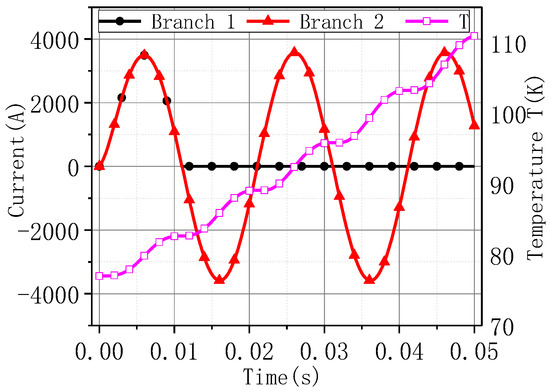 In order to evaluate the temperature rise of the parallel inductance during faults, an electromagnetic-thermal-coupling model was built based on normally conducting coils instead of superconducting coils for a rough check. Coupling the magnetic field (mf) module and the solid heat transfer (ht) module in Comsol Multiphysics, the calculation model of the parallel inductance was established, and the temperature rise during the fault under the adiabatic boundary was calculated. The current waveforms of the two branches are shown in Figure 5 in [12], and the fault after decoupling of the parallel inductance lasts for one more cycle. Figure 17 shows the relationship curve between currents and maximum temperatures of the parallel inductance during a fault. Under this working condition, the maximum temperature of parallel inductance is still less than 115 K. Therefore, the above design scheme is feasible.