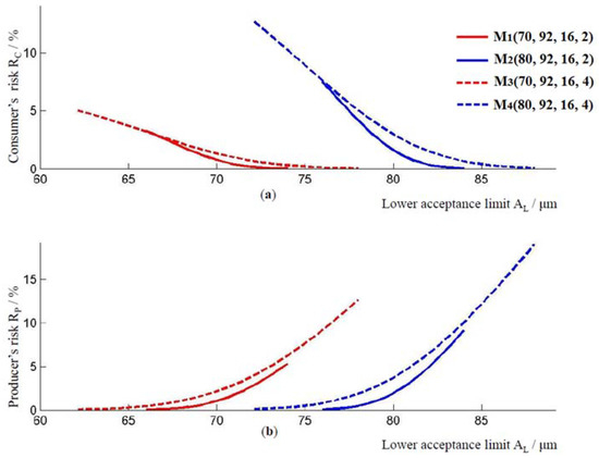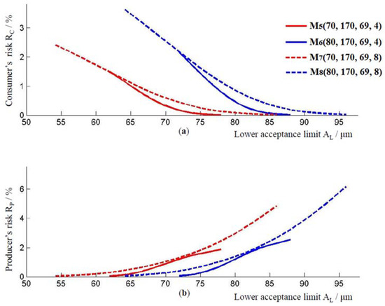 As before, with an increase in the thickness of the coating layer, the producer’s risk and the consumer’s risk decrease, Figure 5. Model , with a higher standard measurement uncertainty compared to model , has a higher producer’s and consumer’s risk, for the coating thickness μm. The same applies to the models and . By comparing the curves for models and , or models and , it could be observed that the values of consumer’s and producer’s risk increase when the lower limit of the tolerance interval changes from 70 μm to 80 μm.