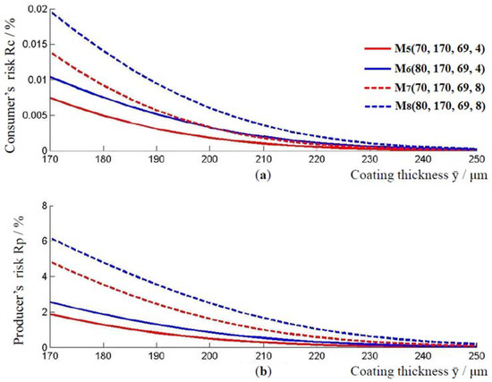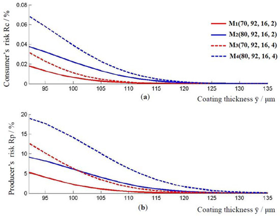 Relationship between the applied thickness of the coating and the consumer’s and producer’s risk. (a) Change in consumer risk with increasing coating thickness, and (b) change in consumer risk with increasing coating thickness, for models .