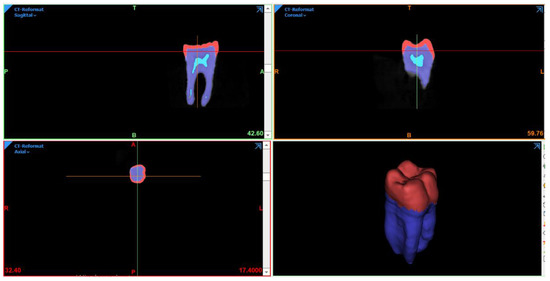 At first, mandibular molar was scanned using cone-beam computed tomography imaging technique (CBCT); (Pax-i3D Green; Vatech, Gyeonggi-do, Republic of Korea). Then, image slices were imported to Mimics 21.0 software (Materialise NV Technologielaan, Leuven, Belgium), and 186 slices were selected from a total of 416 slices. Separate masks were created to isolate dental tissues—enamel; dentin and pulp—in each slice of the image (Figure 1), depending on Hounsfield Units (HU) in the CBCT image (6830–7000 HU for enamel, 4179–6198 HU for dentin and 3499–4617 HU for pulp).