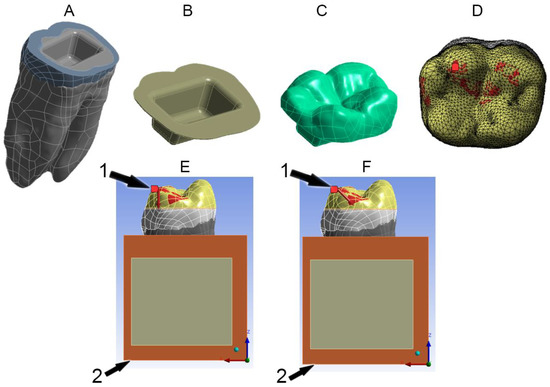 (A): dental tissues; (B): cement layer; (C): endocrown; (D): loading points on endocrown; (E): axial loading; (F): oblique loading. 1: applied force and 2: fixed support (inferior surface of cortical bone).