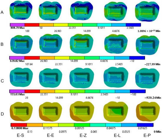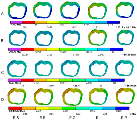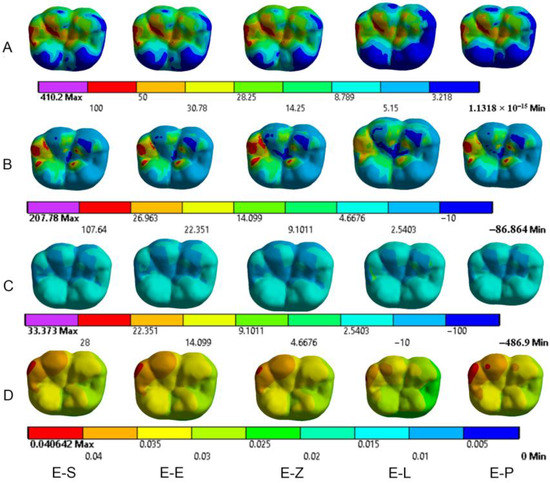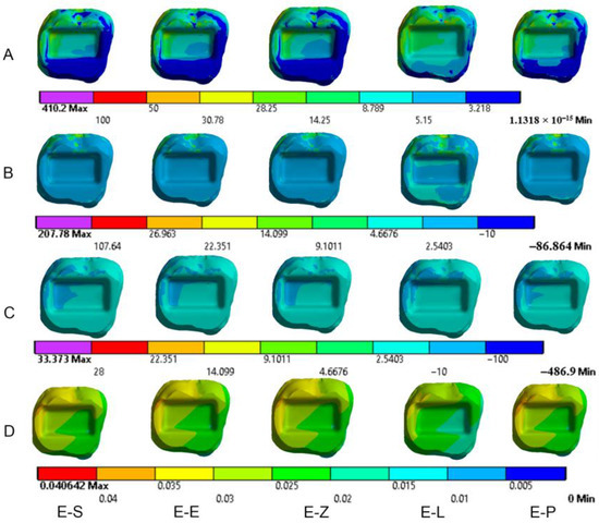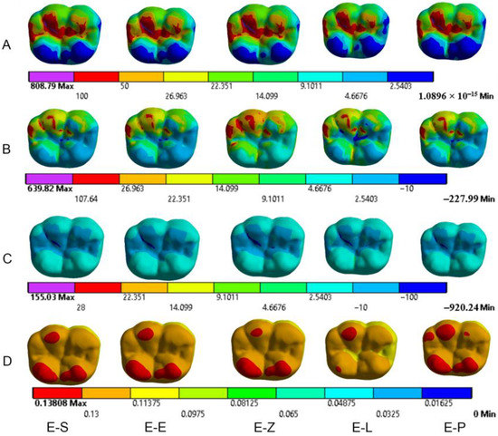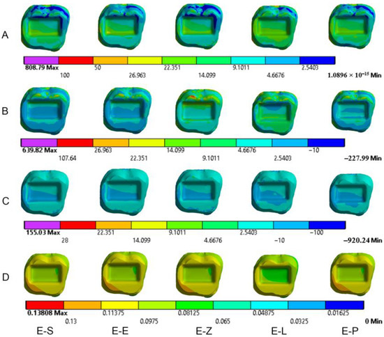 Stress distribution and displacement of endocrowns in all models under oblique loading. (A) von Mises stress, (B) maximum principal stress, (C) minimum principal stress and (D) displacement. E-S: zirconia-reinforced lithium silicate ceramic model, E-E: lithium disilicate glass ceramic model, E-Z: translucent zirconia model, E-L: resin nanoceramic model and E-P: polymer-infiltrated ceramic network model.