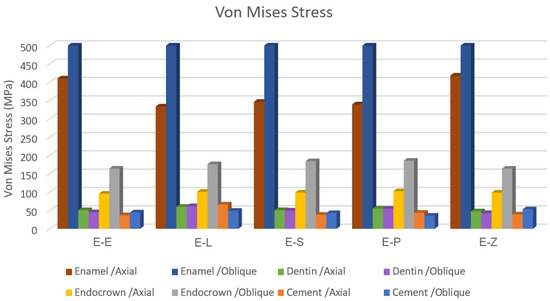 Not surprisingly, oblique loading caused higher stress concentration and greater values of von Mises, tensile and compressive stresses in all structures than axial loading. It also increased the values of total displacement by approximately 32% in all components of the models. This finding, which is in line with other studies [31,39] confirms the harmful effects of nonaxial forces on the tooth–restoration complex [47]. Nonaxial loadings, including oblique loading, resolve to their axial and horizontal components. The axial component distributes stresses along the longitudinal axis of the structure subjected to the loading, while the horizontal component concentrates stresses in this structure.