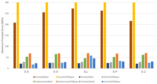 Maximum principal (tensile) stress is concentrated in the distal region of enamel under axial loading (Figure 9). Oblique loading causes higher tensile stresses in dental structures than axial loading in all models (Figure 6 and Figure 11). In addition, greater stress is concentrated in the occlusal surface under oblique loading. The highest maximum principal stress concentration in dental tissues is in the E-L model whatever the direction of the loading was.