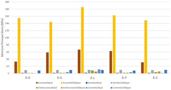 Oblique loading increases the concentration of minimum principal stress in the lingual part of the occlusal surface in all models. The highest values of compressive stress in dental tissues are in the E-L model under both loadings (Figure 7).