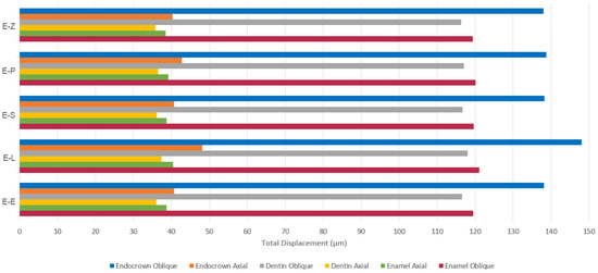 The values of the Mohr–Coulomb (MC) ratio in endocrowns from all materials under axial and oblique loadings are shown in Table 4. The values under oblique loading are higher than axial loading. All values are lower than 1 in all models. However, the E-Z endocrown shows the lowest MC ratio, while the EL and E-P endocrowns show the highest MC ratios. The total displacement of endocrowns for most of the models is in the same range, except for the E-L endocrown, which shows the highest displacement (48.1 µm under axial loading and 148.0 µm under oblique loading). The E-Z endocrown records the lowest values of displacement (40.2 µm under axial loading and 138.0 µm under oblique loading), as shown in Figure 8. The maximum displacement occurs in the occlusal surface of the endocrown whatever the material and the direction of the loading were (Figure 3 and Figure 4).