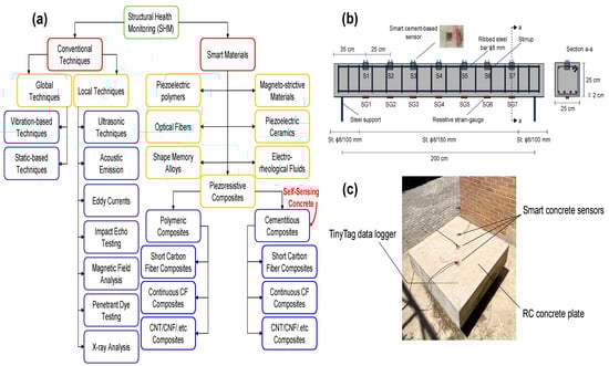 The measurement of a structure’s operating environment and signs of deterioration affecting its functioning, serviceability, and safety is generally referred to as “structural health monitoring” (SHM). It requires ongoing monitoring and technical data collection, validation, and analysis to support life-cycle management choices [1]. SHM can be divided into two main directions: traditional techniques and smart materials (Figure 1a), which include cementitious composites that are referred to as “self-sensing concrete” (cement-based sensors), as shown in Figure 1b,c. SHM approaches have been investigated using traditional or more advanced methods that depend on embedded or surface-mounted strain sensors. Fibre Bragg grating is an example of an advanced localised technique, whereas time domain reflectometry in fibre optics is an example of a modern distributed technique of SHM [2,3,4,5,6,7,8]. Previous investigators [9,10] have tried to insert optical fibres into the textile-reinforced concrete (TRC) elements. This sensing system is commonly implemented in structural elements, which necessitates physical adaptation in the load-bearing elements, and as a result, the structural performance may be affected. However, the sensory system is more expensive and more complicated, as it requires special workers. On the other hand, more advanced technologies such as piezoelectric sensors, electrochemical sensors, wireless sensing, and self-sensing concrete are of great importance to researchers [11]. “Self-sensing concrete” refers to the ability of the concrete material to detect its internal stresses, strains, and damage under different loading and environmental conditions without the need for any internal or external sensors [12].