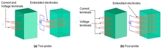 Different electrode configurations for resistance measurement in the cementitious matrix: (a) two-probe technique; (b) four-probe technique.