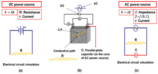 The DC resistance is distinct from the AC impedance, as the latter includes more complicated measurements such as inductance and capacitance along with the resistance, as shown in Figure 4. Using an AC power source with a high frequency eliminates the effect of capacitance caused by the presence of the two parallel electrodes [81], as shown in Figure 4c.