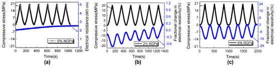 Effect of NGPs dosage on the fractional change in resistivity under compressive loading: (a) without NGPs; (b) with 2% NGPs; (c) with 6% NGPs [73].