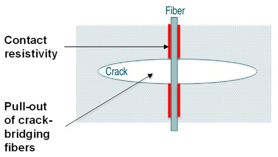 Piezoresistivity in a cement-based matrix containing short carbon fibres is caused by a minor slippage of the fibre–matrix interface, as illustrated in Figure 6 [58,116], and an accompanying increase in the interface resistivity [118,119]. There are other causes of piezoresistivity in cement-based materials containing conductive fillers, such as the change in intrinsic resistance of the conductive admixtures, the change in contact resistance between the functional additives, the change in tunnelling distance between the conductive admixtures, and the change in capacitance distance of the conductive fillers [57]. All the previous causes are summarised in Table 2. It is worth mentioning that one or more reasons contribute to the change in piezoresistivity [57].