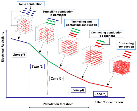 The resistivity of the testing material can vary by many orders of magnitude when conductive particles, usually made of metal or carbon, are introduced to a non-conducting matrix. The results obtained by previous investigators indicate that once the particle concentration is raised above a particular threshold level, resistivity abruptly decreases. At that concentration, the system begins to consist of limitless chains of particles. The percentage of particles in the infinite conductive paths increases as the particle concentration rises, thereby helping with the conduction process [131,132,133]. Figure 7 (zones 2, 3, and 4) shows that increasing the dosage of conductive fillers results in a precipitous decrease in resistivity, and this range is called the percolation threshold. The volume fraction at which the conductive fillers contact each other (contacting conduction) is called the percolation threshold [134]. However, contacting conduction is not the only way to attain the percolation threshold. If the conductive fillers are close enough to cross the energy barriers (tunnelling conduction and/or field emission conduction), the percolation threshold can also be achieved [135]. There is no identified dosage of conductive fillers to attain the percolation threshold, as it depends on many variables such as the composite’s microstructure, the type of conductive fillers, their aspect ratio, their orientation, and the presence of externally applied loads [134,136].