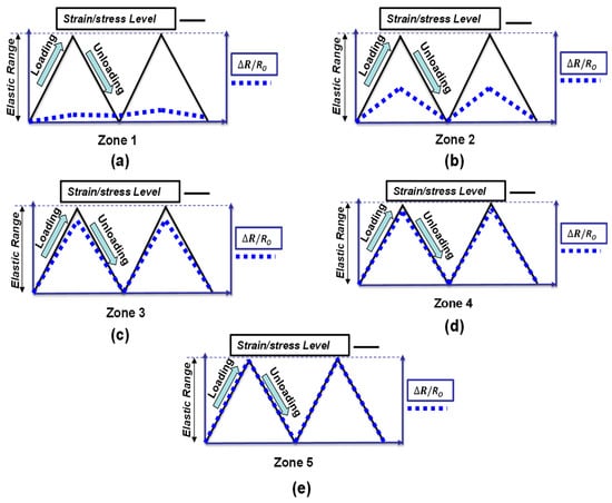 As piezoresistivity is an electromechanical phenomenon in which the material’s resistivity alters reversibly under the applied strain, the gauge factor must be determined in the case of reversible alterations in resistivity due to the applied loads. It should be calculated within the elastic range, as the plastic deformations do not reflect the genuine gauge factor. Additionally, it is preferable to measure the resistance under progressively rising strain amplitudes rather than static loading up to the failure point, as the former state gives a strong indication of the reversibility after unloading [19].