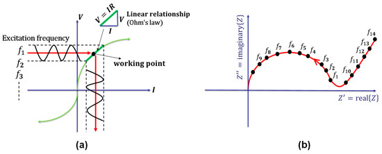 Solving Equation (5) for the whole frequency range is very complex from a mathematical point of view and leads to complicated mathematical operations. As a result, it is much easier to solve it using ACIS for a given frequency, , with only two variables: the amplitude and the phase shift (illustrated in Figure 10b) [143]. A complex representation (Nyquist plots) in the polar or rectangular form (the rectangular form used in the following explanation, Figure 9b) can be used to display the two quantities as a single frequency. It is worth mentioning that the imaginary part of the complex plane is just for mathematical manipulations, and there is nothing fictitious about the physical quantity impedance [142].