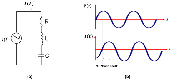 (a) a simple AC circuit (RLC) with a resistor, a capacitor, and an inductor in series; (b) the phase shift (𝜃 = 0 for a resistor; 𝜃 = +90° for a capacitor; 𝜃 = −90° for an inductor).