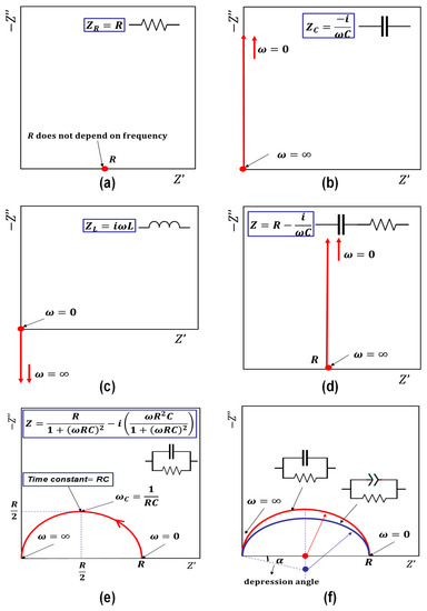 Complex plans (Nyquist plots) of typical ACIS plots for different combinations of a resistor, a capacitor, and an inductor: (a) the representation of a resistor; (b) the representation of a capacitor; (c) the representation of an inductor; (d) the representation of a capacitor and a resistor in series; (e) the representation of a capacitor and a resistor in parallel; (f) the representation of a constant phase element (CPE).