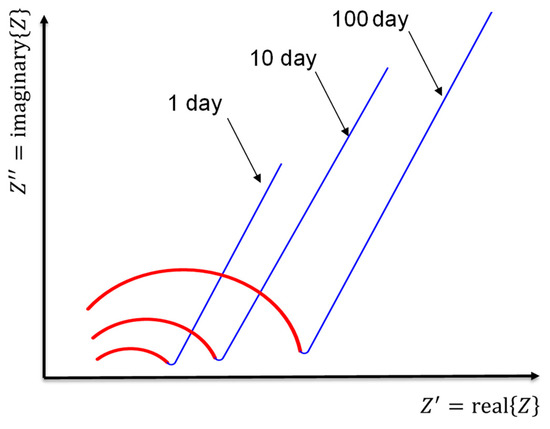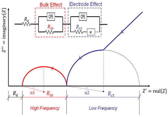 Although physical and chemical phenomena may occur at various frequencies, the time constant or the characteristic frequency can discriminate between them. The different phenomena will emerge as distinct arcs, as illustrated in Figure 12, if their time constants vary by at least two orders of magnitude [144]. Otherwise, there may be an overlap between the two arcs, necessitating computational techniques to determine the values of R and C (R is the electrical resistance, as illustrated in Equation (1), and C is the capacitance calculated from the following relationship: C = o A/L, where is the relative permittivity (dielectric constant), o is the permittivity of free space (8.85 × 10−12 F /m), and A and L are as defined in Equation (1)). As a result, the time constant of a particular material depends more on its resistivity and relative permittivity (dielectric constant) than on its geometry [144]. Since the behaviour of various circuit components may be used to understand many physical processes, the equivalent circuit model, which is covered in greater detail below, can simulate a system’s reaction.