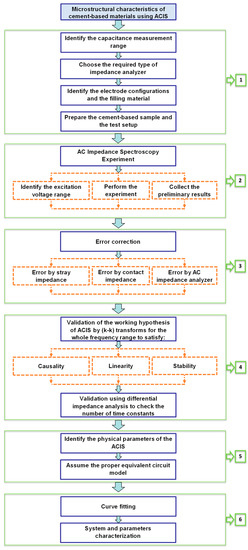 The required steps for applying the ACIS technique are illustrated in a flow chart, as shown in Figure 13. The chart consists of six main steps. Step 1 includes preparing samples, selecting the electrode type and configuration, and identifying the AC impedance analyser range. Step 2 contains carrying out the test and collecting the preliminary results. As shown in Figure 14a,b, step 3 represents error correction, which includes stray impedance and contact resistance [75]. Step 4 incorporates the validity of the preliminary results to ensure causality, linearity, and stability, followed by differential impedance analysis to check the number of time constants. In step 5, the physical parameters and the equivalent circuit model can be identified. Finally, step 6 contains the curve fitting and the system characterisation [75,144,151,152,153,154,155].