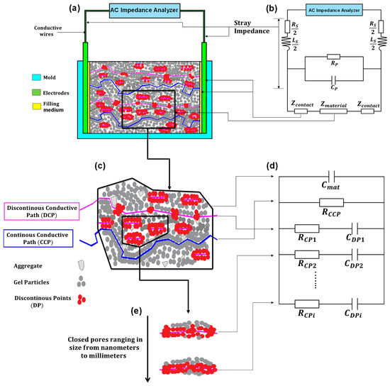 The equivalent circuit model and the corresponding physical meaning in the case of cement-based materials: (a) the preparation of a cement-based sample; (b) the electrical representation of stray impedance; (c) the simulation of DCP and CCP; (d) the equivalent circuit model; (e) the simulation of closed pores.