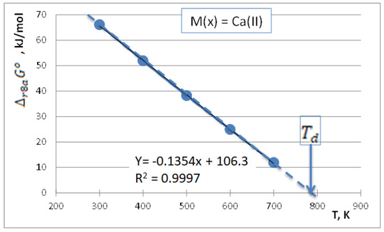 The temperature dependence of the standard molar Gibbs energy change of reaction (11) for M(x) = Ca(II). The extrapolated line crosses zero at Td = 785 K.