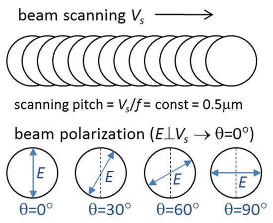 Scheme of laser experiments with rotation of the beam polarization relative to the beam scanning direction (Vs is the scanning velocity and E is the electric field of the linearly-polarized laser beam).