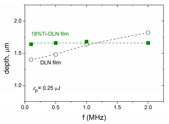 Influence of the pulse frequency on the ablation depth of microgrooves formed on the Ti-DLN film at the identical parameters of the pulse energy εp = 0.25 μJ and effective pulse number Neff = 2wo/(Vs/f), compared to the ablation depth vs. pulse frequency for the DLN film (E ‖ Vs).