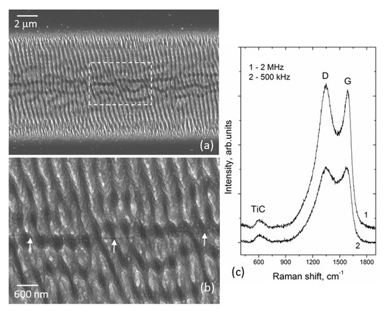 Figure 3 shows the ablation depth vs. pulse frequency dependence for the Ti-DLN films in comparison with that for a metal-free DLN film. It is seen that the ablation depth is practically constant (≈1.65 μm) in the range of f = 0.1–2 MHz, presumably due to a higher thermal diffusivity of the metal-doped film. So the beneficial effect of the higher pulse frequencies is only in the shortened processing time, not in the increased ablation rate. The main negative effect is the crack formation along the groove bottom during ablation and LIPSS formation at f = 2 MHz, shown in Figure 4a,b. In addition, the enhanced surface graphitization of the Ti-DLN film follows from the comparison of Raman spectra (in Figure 4c) of the grooves formed at f = 2 MHz and f = 500 kHz. The Raman spectra of the grooves formed at the lower pulse frequencies (f = 100 kHz and f = 500 kHz) were reported [14] to be characterized by three peaks: D-peak at 1350 cm−1, G-peak at 1580 cm−1, and TiC peak at ~600 cm−1. The higher intensity ratio of the D and G peaks together with a shift of the G peak to the higher frequency (~1590 cm−1) evidence the enhanced surface graphitization in the groove formed at f = 2 MHz. The similarity of the TiC peaks is likely to evidence that the content of the TiC phase in the surface layer is not changed during ablation at different pulse frequencies. Both the destruction of the coating along the groove center and higher graphitization degree result from higher surface temperatures at f = 2 MHz. For the above reasons, laser experiments on the LIPSS formation at different angles of the beam polarization were carried out at the lower pulse frequencies f = 100 kHz and f = 500 kHz.