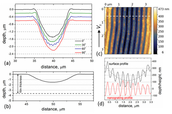 The rotation of the beam polarization had a minor influence on the ablation depth/rate, as is seen in the AFM surface profiles (in Figure 6a) measured across the microgrooves using a diamond-coated tip in the contact-mode. The ablation depth was found to slightly change with the polarization angle in the range of 1.5–1.6 µm. Figure 6b shows the true groove profile just to underline that (i) the fs-LIPSS are produced at a quite large distance from the film/substrate interface, and (ii) the slope of the groove surfaces is changed from the center to the edges (by ~30°). The data of the nanograting depth is obtained from AFM images of the LIPSS recorded with sharp Si tips in the central areas of the grooves. As an example, the AFM data are presented in Figure 6c,d for the beam polarization E ⊥ Vs. The nanograting profile becomes more clearly pronounced after subtraction of a polynomial (quadratic) background from the surface profile, as shown in Figure 6d. The LIPSS depth is then determined to be of 140–210 nm. For the other LIPSS orientations, the grating depth values are somewhat smaller, being in the range of 130–180 nm.