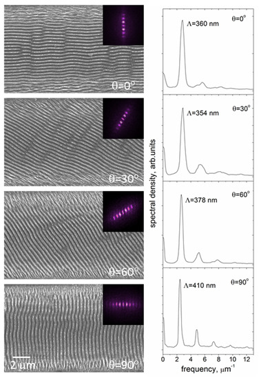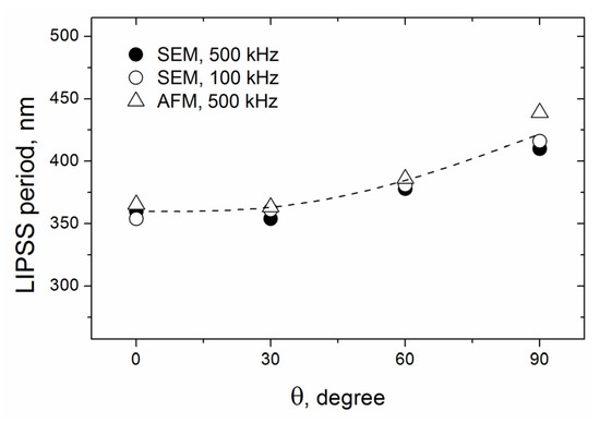 The data of the LIPSS periods vs. polarization angle are summarized in Figure 8 for the two pulse frequencies f = 500 kHz and f = 100 kHz. First, it is seen that the periods are practically the same for the two frequencies. Second, the LIPSS periods of Λ = 360 ± 5 nm are nearly constant in the range of the polarization angles θ = 0–30°, and then the periods are gradually increased to the values of Λ = 380 ± 2 nm at θ = 60° and Λ = 420 ± 10 nm for the ripples formed perpendicular to the beam scanning direction (θ = 90°). The Λ values are larger than λ/2, corresponding to the formation of low spatial frequency LIPSS (LSFL) (the term used in conventional LIPSS classification [16,17]) in the Ti-DLN films at the condition of F > Fth.
