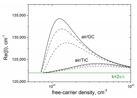 Re(β) vs. Ne for the air/GC and air/TiC interfaces, λ = 515 nm: solid curves—No damping of free electrons, dashed curves—The damping time τ = 1 fs, dashed-dot curves—τ = 3 fs.