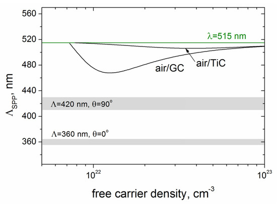 ΛSPP vs. Ne for the air/GC and air/TiC interfaces (the damping of free electrons is ignored); the marked grey regions correspond to the experimentally obtained LIPSS periods increased from the Λ = 360 ± 5 nm (for E ⊥ Vs) to the Λ = 420 ± 10 nm (for E ‖ Vs).