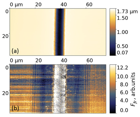 The microgrooves formed on the Ti-DLN film at f = 500 kHz and different angles of the beam polarizations (shown in Figure 5 and Figure 7) were studied using lateral force microscopy, aimed to clarify a question of how the periodical relief and its orientation would influence the nanoscale friction behavior. The typical images of the surface relief and friction force are shown in Figure 11 for the microgroove with the LIPSS rotated by θ = 30° (see Figure 7). The tip scanning area (X × Y) was 75 µm × 37.5 µm in the LFM tests. It is clear that because of the large scanning area and groove depth (of 1.5–1.6 μm) the surface grating is not ‘visible’ on the relief image in Figure 11a, as compared to the AFM image in Figure 6c. The diamond-coated Si tips were specially used in the LFM imaging of the grooves to reduce the tip wear and to minimize the capillary forces which strongly influence the friction forces [40]. The values of the pull-off forces were determined to be Fpull-off = 15 nN inside the microgrooves and Fpull-off = 20 nN on the original Ti-DLN surface, much smaller than the tip load Fload = 200 nN.