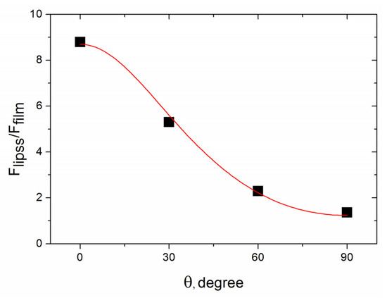 The ratio of the friction forces inside the groove to the friction forces on the original film, A = Flipss/Ffilm is shown in Figure 12 as a function of the polarization angle, identical to the angle of rotation of nanoripples (see Figure 7). It is seen that the FF value on the groove bottom is defined by (i) the presence of the periodical nanostructure and (ii) the angle of rotation of the nanoripples relative to the groove direction (and tip scanning direction). The ratio A decreases with the rotation angle. Such behavior is caused by an increase of the average friction force during the tip moving across periodically ascents and descents of the nanoripples, and its dependence on the slope of the ripple surface (along the tip moving line), with the slope decreasing as the rotation angle of the LIPSS is changed from θ = 0° to 90°. It should be noted that accurate calculations of the interrelations between the forces acting on the cantilever tip, and signals registered in the AFM contact-mode—DFL (deflection) and LF (lateral force), are quite complex and require taking into account elastic properties and geometry of both the cantilever and probe as well as the capillary forces [46]. Omitting the details of our estimation of the lateral forces (to be published in our next paper on LFM of laser-nanostructured DLN films), we briefly mention that it was based on the AFM surface profiles of the groove bottom (shown in Figure 6c) and the ripple shape close to a sinusoid with the maximal slope angle of αsin = 60°. Then we performed numerical simulations of the A = Flipss/Ffilm for the bottom relief, assuming it is an ideal periodical array of the sinusoidal ripples with the rotation angle θ relative to the groove bottom and the maximum angle of the relief slope αsin = 60°. For the ‘ideal periodical sinusoidal relief’ the value of A(θ), averaged over a given surface area, is a function of the friction coefficients of the laser-graphitized surface inside the groove (μgr) and original film surface (μ0), and the angles of rotation θ and slope αsin(x,y,θ), under the condition of a linear dependence of the friction force on the tip load (i.e., Ffr = µFload). The best fit of the simulations with the experimental data of A = Flipss/Ffilm, shown in Figure 12 by a red curve, was obtained for the friction coefficients of μgr = 0.55 and μ0 = 0.69.