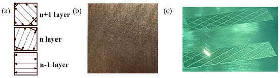 SLM forming scanning strategy diagram: (a) Scanning strategy (strip partition, partition width 20 mm, laser S-shaped two-way routing, interlayer rotation 67°); (b) SLM-shaped test piece; (c) SLM laser routing.