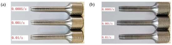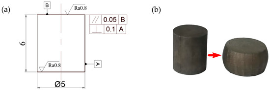 During the compression test, there was great friction force at the end face of the sample, which hindered the transverse deformation of the sample, causing the sample to have a waist drum shape, affecting the accuracy of the test results, where the smaller the height to diameter ratio L/d, the greater the influence of the end friction on the test results. The ratio could be appropriately increased to reduce the impact of end friction; however, an excessive ratio would lead to longitudinal instability [30]. According to the national standard requirement of 1 ≤ L/d ≤ 2, the nominal size of the designed test piece was Ø5 × 6 mm. The loading speed V of the testing machine was set to 0.36 mm/min, and the strain rate calculated according to Equation (7) [32] was 1 × 10−3 s−1.