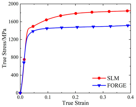 As shown in Figure 4, the real stress-strain curves of SLM and forged 15-5 PH steel specimens have good repeatability. Figure 5 shows that the true stress-strain curve of the SLM-formed 15-5 PH test piece had a micro-segment platform after the yield point. From the perspective of forming technology, the reason for this phenomenon was possibly because some of the powder materials were not fully melted and consolidated during SLM forming, resulting in a small number of pores in the formed specimen. During the forging process, the specimen was upset and compacted many times, and the interior of the specimen was dense. Therefore, the pores in the SLM-shaped specimen were densely compressed during the compression process and would be concentrated near the yield point and then compacted. For macroscopic performance, the strain increased, while the stress was almost unchanged. This also confirmed that the SLM 3D printing mentioned above caused the density to be slightly less than 100%. Moreover, the work hardening effect of the SLM-shaped specimen was more obvious than that of the forged specimen, and the resistance to plastic deformation was stronger.