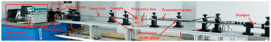 The SHPB device used in this test is shown in Figure 6. The diameter of the bullet, the incident rod, and the transmission rod are all 14.5 mm, the bullet is 200 mm long, the incident rod is 2000 mm long, and the transmission rod is 1500 mm long. The rod is made of high-strength spring steel, with an elastic modulus of 210 GPa and a density of 7.85 g/cm3.
