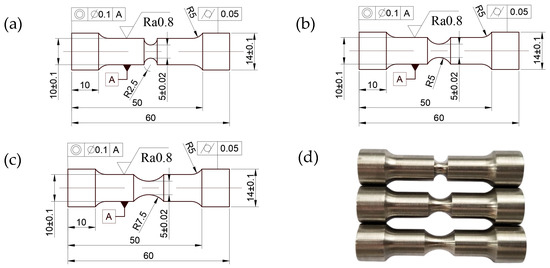 Dimensions and outline of the notch tensile test piece: (a–c) Tensile specimen 2D engineering drawing, and (d) Tensile samples.