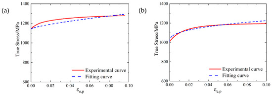 where the number of parameters D1, D2, and D3 denoted the fitting results of the previous section. According to the quasi-static tensile test results under different strain rates, the failure parameter values D4 of the SLM and forged 15-5 PH steel were 0.0773 and 0.1006, respectively. The comparison results between the fitting curve obtained according to Equation (27) and the test data points are shown in Figure 24.