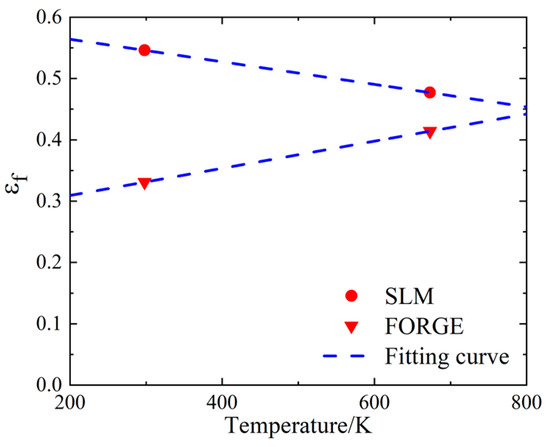 As shown in Figure 25, the fitting curve of the SLM-formed 15-5 PH steel showed a downward trend, while the fitting curve of the forged 15-5 PH steel showed an upward trend. This also confirmed that the failure strain of the SLM and forged 15-5 PH steel mentioned above was affected by temperature differently.