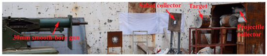 A 30-mm smooth bore gun was used as the launching platform, and the test layout is shown in Figure 26. To avoid ballistic deflection of the projectile during long-distance flight after it exited the muzzle, the muzzle was located about 3.5 m away from the target surface.