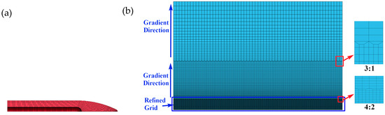 To reduce the calculation period, the target plate was processed in two steps. First, because in this work we studied forward penetration, we used a quarter model to model. Second, the mesh was densified within the range of 30 mm in the radius direction of the target point of the projectile. In the axial direction, a transition grid was used, and the first grid transition was conducted within the range of 30–100 mm from the axis, with a transition ratio of 4:2. A second grid transition was conducted within the range of 100–225 mm from the axis, with a transition ratio of 3:1. In the radial direction, the parts 30–100 mm away from the axis and 100–225 mm away from the axis were treated by gradual grid change, with a gradual change rate of 1.05, to ensure the correct propagation of stress waves in the target plate.